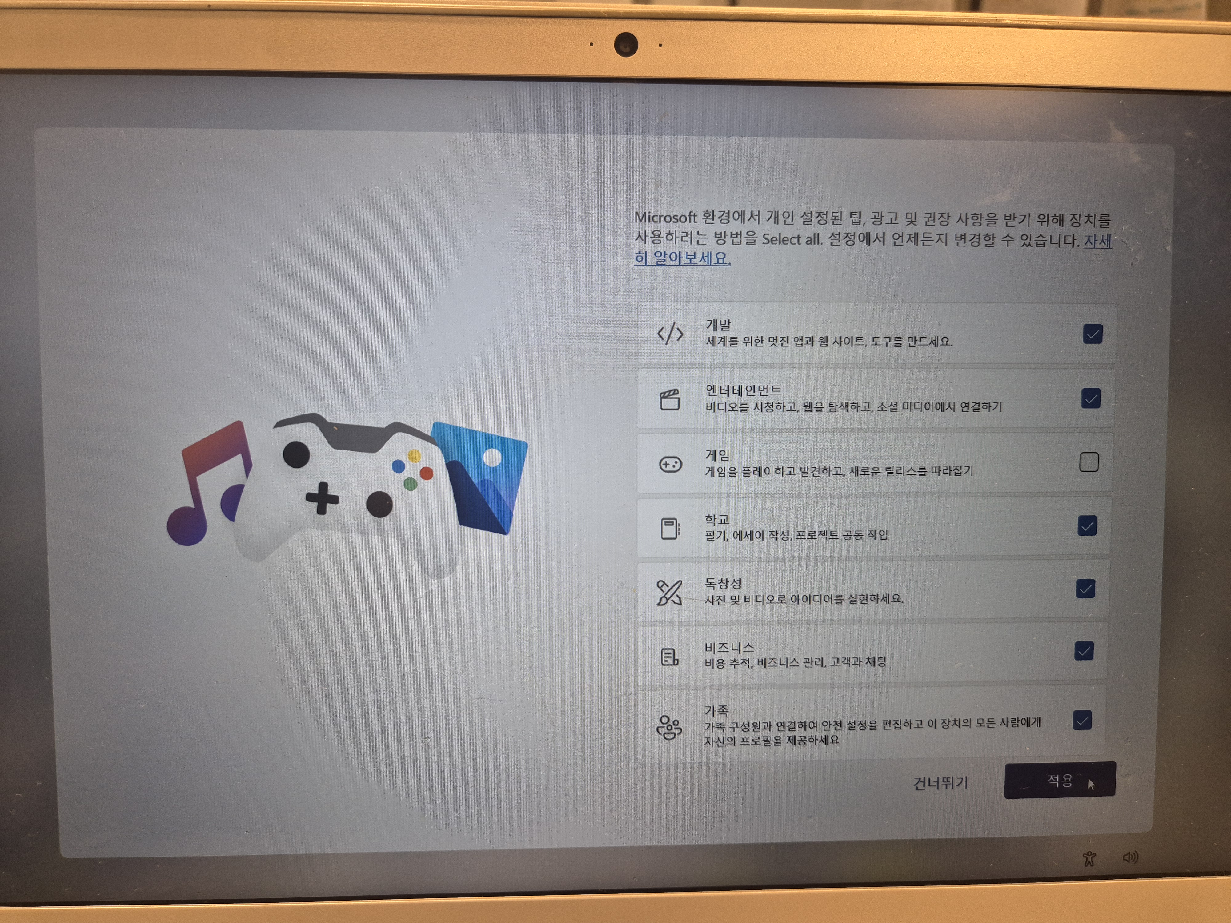 - Windows 목적 선택 → 적용 or 건너뛰기