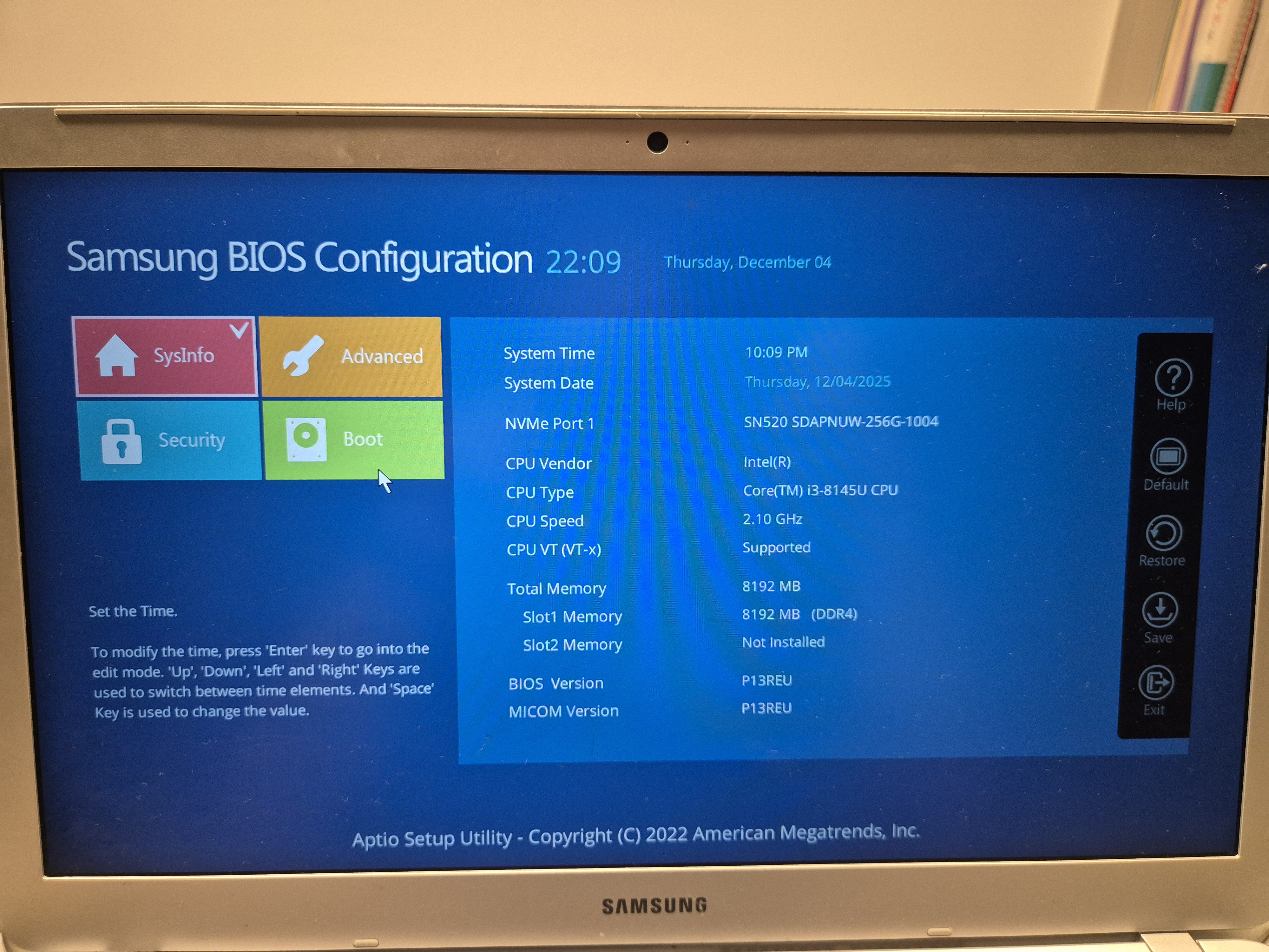 노트북을 끄고 다시 켜면서 BIOS 진입키(F2, F10 등)를 버튼 연타합니다.